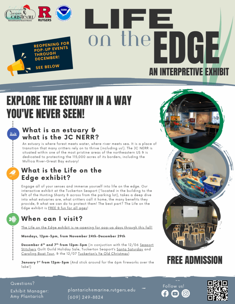 You read that right! Our Life on the Edge Exhibit, located at the Tuckerton Seaport, will be reopening for pop-up dates through the end of the year!